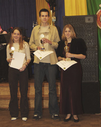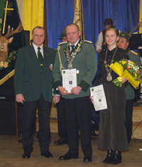 Leider war nur Sarah Klümper, Iris Taudien und Robert Hoppenrath anwesend um die Pokale persönlich entgegen zu nehmen. Anschließend übergab der Bezirkssportleiter Hans-Dieter Schmitz die Mannschaftspokale im Erwachsenenbereich.Den 1. Platz belegte die Mannschaft vom Essener SV 1390 mit den Schützen M. Stoika, K. Sielisch und W. Fischer Auf den 2. Platz kam die Mannschaft des ABSV E.-Bergeborbeck mit den Schützen D. v.Beek, M. Mahns und W. Schymiczek Dritter wurde die Mannschaft der Schützengilde Essen-Ost mit den Schützen S. Slamek, M. Walter und L. Siebert Die weiteren Plazierten sind: 4. Platz BSV Frintrop 1919 Essen, 5. Platz ABSV E.-Dellwig und 6. Platz ABSV E.-Borbeck Ein besonders feierlicher Programmpunkt folgte. Hierzu zogen die anwesenden Vereinsfahnen, das Stadtbanner mit dem Assindiakönig, der Bezirkskönig und die Schülerprintzessin 2003 auf die Bühne. Werner Fischer bedankte sich bei der Schülerprinzessin Sarah Klümper und Bezirkskönig Walter Hofäcker für ihren Einsatz im Jahr 2003. Anschließend wurde die Bezirksjugendkönigin Dagmar Drees vom BSV Frintrop 1919 Essen und der Bezirkskönig Frank Althoff vom ABSV E.-Bergeborbeck für das Jahr 2004 gekrönt. Zu diesem Zweck wurde ihnen die jeweilige Kette als äußeres Zeichen übergeben. Dagmar Drees schoß ihren Titel mit einem 52,8 Teiler. Frank Althoff setzte sich knapp mit einem 11,4 Teiler gegen seine starken Kontrahenten durch. Die Beiden werden den Bezirk 02 beim Landeskönigschießen in Dinslaken und beim Landesjugendkönigschießen vertreten.![]() Anschließend wurden die Sportschützen/innen, die erfolgreich an den Landesverbandsmeisterschaften und an der Deutschen Meisterschaft teilgenommen hatten mit einer Plakette ausgezeichnet. Persönlich entgegen nehmen konnten diese Auszeichnung Hella Mika, Nadine Buschmann, Hans-Werner Buuschmann, Nicole Dechnar und Klaus Dechnar. Nach so vielen Ehrungen wurde nun erst einmal für ein paar Musikstücke unterbrochen und das Tanzbein geschwungen. Danach ging es mit den Ehrungen des Bezirkes, Rheinischen Schützenbundes und Deutschen Schützenbundes weiter. Mit der Verdienstnadel in Bronze des Bezirkes 02 wurden ausgezeichnet: